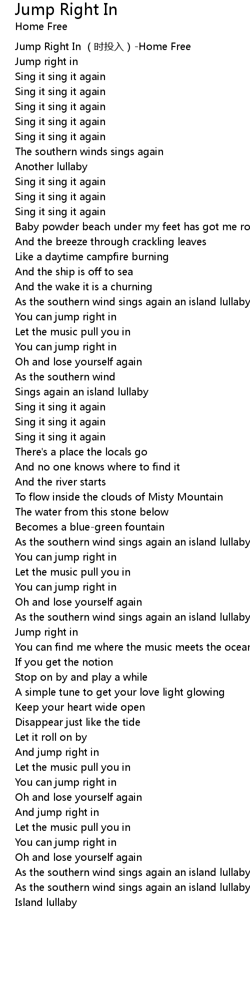 | [00:00.00] | Jump Right In (时投入)-Home Free |