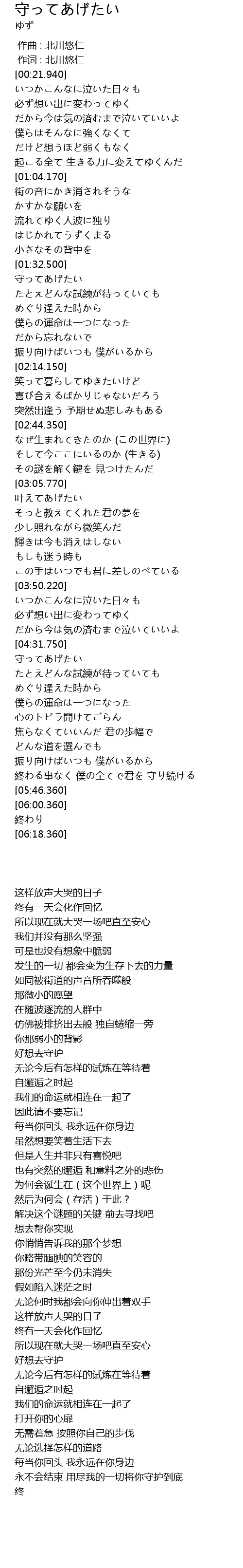 | [05:31.170] | 終わる事なく 僕の全てで君を 守り続ける |