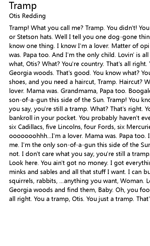 Tramp! What you call me? Tramp. You didn't! You don't wear continental clothes, or Stetson hats. Well I tell you one dog-gone thing. It makes me feel good to know one thing. I know I'm a lover. Matter of opinion. That's all right, Mama was. Papa too. And I'm the only child. Lovin' is all I know to do. You know what, Otis? What? You're country. That's all right. You straight from the Georgia woods. That's good. You know what? You wear overalls, and big old brogan shoes, and you need a haircut, Tramp. Haircut? Woman, you foolin'...ooh...I'm a lover. Mama was. Grandmama, Papa too. Boogaloo. All that stuff. And I'm the only son-of-a-gun this side of the Sun. Tramp! You know what, Otis? I don't care what you say, you're still a tramp. What? That's right. You haven't even got a fat bankroll in your pocket. You probably haven't even got twenty-five cents. I got six Cadillacs, five Lincolns, four Fords, six Mercuries, three T-Birds, Mustang, ooooooohhh...I'm a lover. Mama was. Papa too. I tell you one thing. Well tell me. I'm the only son-of-a-gun this side of the Sun. You're a tramp, Otis. No I'm not. I don't care what you say, you're still a tramp. What's wrong with that? Look here. You ain't got no money. I got everything. You can't buy me all those minks and sables and all that stuff I want. I can buy you minks, rats, frogs, squirrels, rabbits, ...anything you want, Woman. Look, you can go out in the Georgia woods and find them, Baby. Oh, you foolin'. You're still a tramp. That's all right. You a tramp, Otis. You just a tramp. That's all right. You we