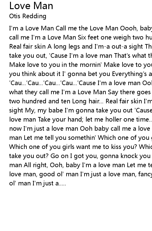 I'm a Love Man Call me the Love Man Oooh, baby I'm the Love Man That's what they call me I'm a Love Man Six feet one weigh two hundred and ten A Long hair... Real fair skin A long legs and I'm-a out-a sight There ain't no doubt I'm gonna take you out, 'Cause I'm a love man That's what they call me I'm the Love Man Make love to you in the mornin' Make love to you at night now Make love to when you think about it I' gonna bet you Everything's alright 'Cau...'Cau...'Cau...'Cau...'Cause I'm a love man Ooh baby I'm a love man That's what they call me I'm a Love Man Say there goes a love man Six feet one weigh two hundred and ten Long hair... Real fair skin I'm long legged and I'm-a out-a sight My, my babe I'm gonna take you out 'Cause I' a love man Ooh baby I'm a love man Take your hand; let me holler one time...AAWW! Love man that's all I am now I'm just a love man Ooh baby call me a love man Yes I am, I'm just a love man Let me tell you somethin' Which one of you girls want me to hold you? A Which one of you girls want me to kiss you? Which one of your girls wants me to take you out? Go on I got you, gonna knock you all night 'Cause baby I'm a love man All right, Ooh, baby I'm a love man Let me tell ya! I'm sayin' I'm just a love man, good ol' man I'm just a love man, fancy man I'm just a love man, good ol' man I'm just a..... |