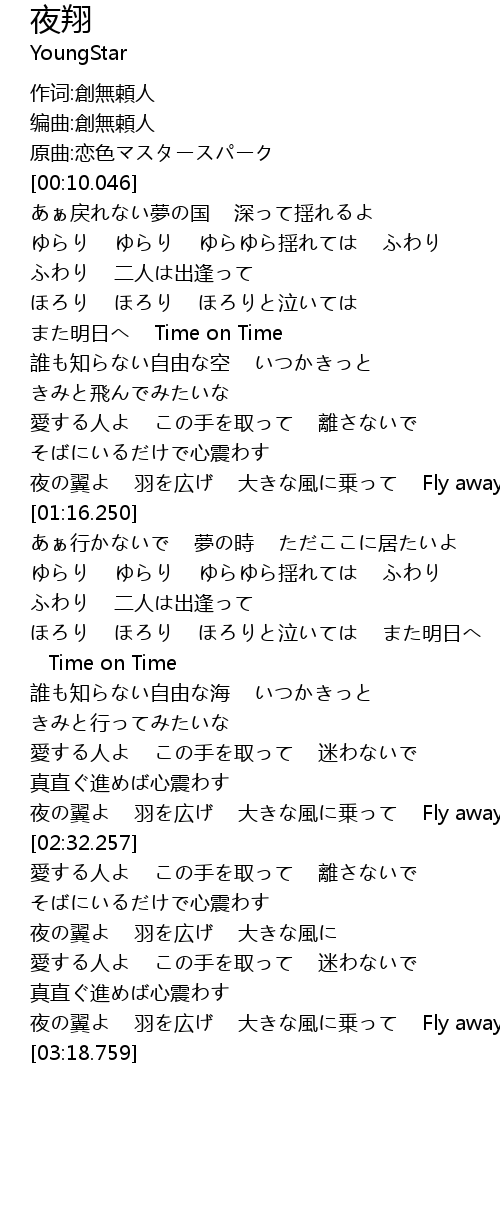 | [01:06.110] | 夜の翼よ 羽を広げ 大きな風に乗って Fly away |