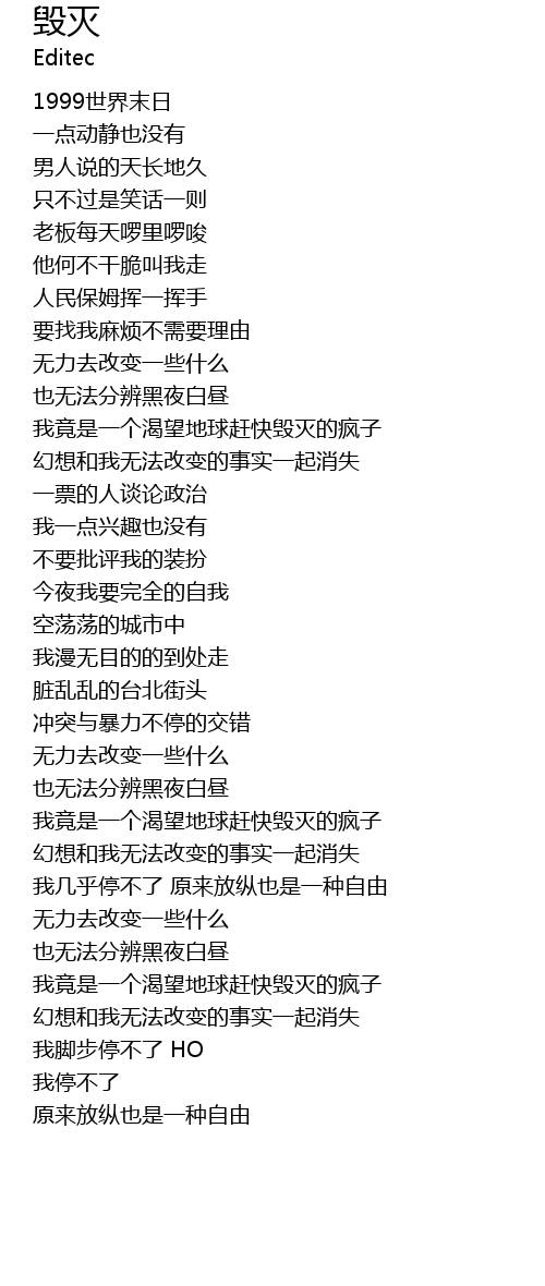 | [03:31.15] | 我竟是一个渴望地球赶快毁灭的疯子 |