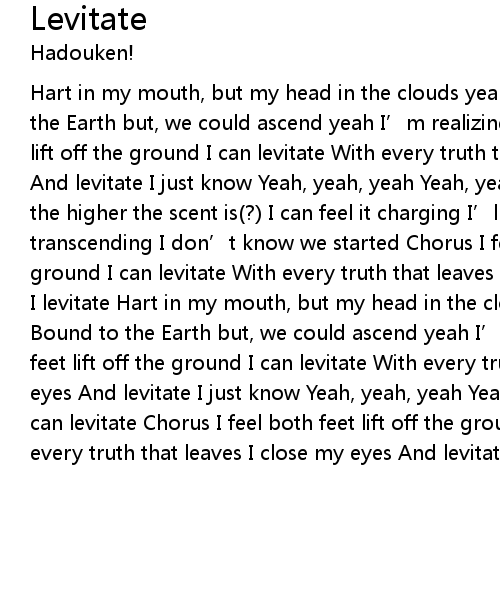 | Hart in my mouth, but my head in the clouds yeah I can feel it rising Bound to the Earth but, we could ascend yeah I' m realizing Chorus: I feel both feet lift off the ground I can levitate With every truth that leaves I close my eyes And levitate I just know Yeah, yeah, yeah Yeah, yeah, yeah The air is electric, the higher the scent is? I can feel it charging I' ll never forget you with transcending I don' t know we started Chorus I feel both feet lift off the ground I can levitate With every truth that leaves I close my eyes And levitate I levitate Hart in my mouth, but my head in the clouds yeah I can feel it rising Bound to the Earth but, we could ascend yeah I' m realizing Chorus I feel both feet lift off the ground I can levitate With every truth that leaves I close my eyes And levitate I just know Yeah, yeah, yeah Yeah, yeah, yeah I can levitate I can levitate Chorus I feel both feet lift off the ground I can levitate With every truth that leaves I close my eyes And levitate I levitate |
