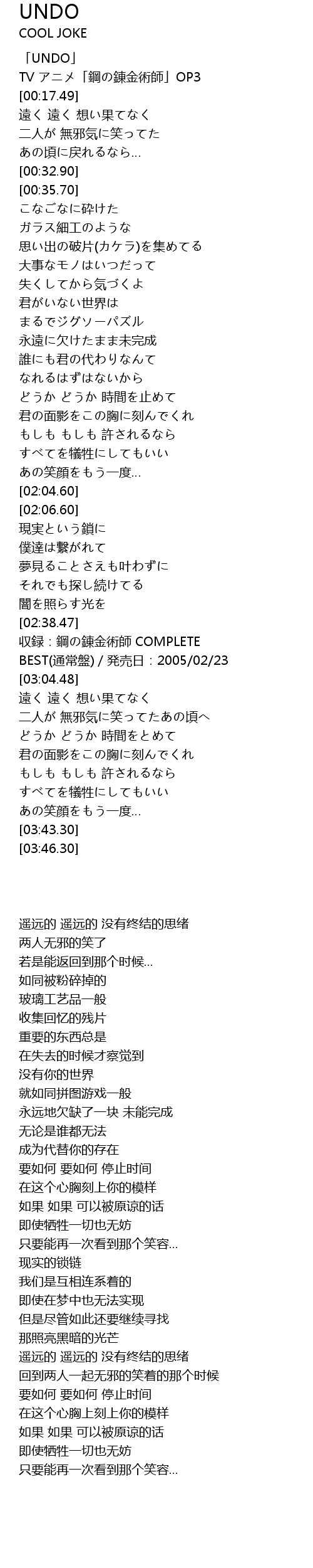 | [02:51.47] | 収録:鋼の錬金術師 COMPLETE BEST(通常盤)/発売日:2005/02/23 |
