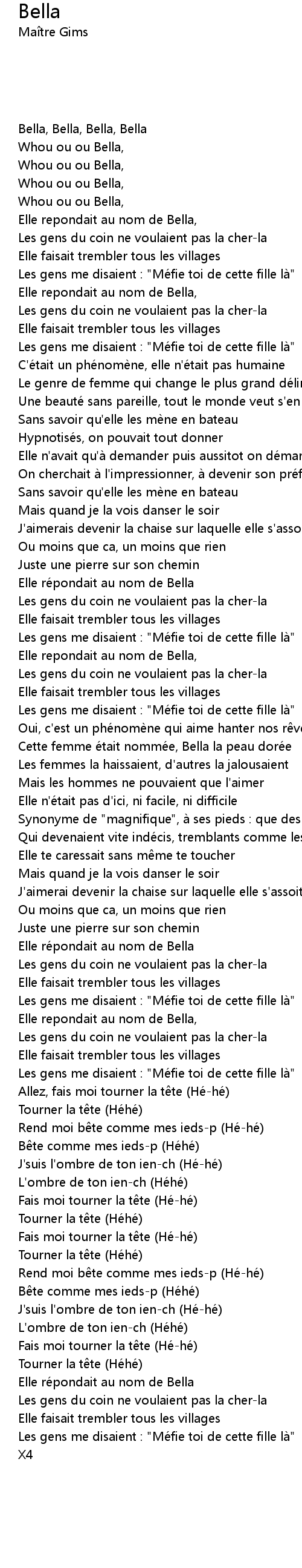 | [01:36.09] | Cette femme e tait nomme e, Bella la peau dore e |