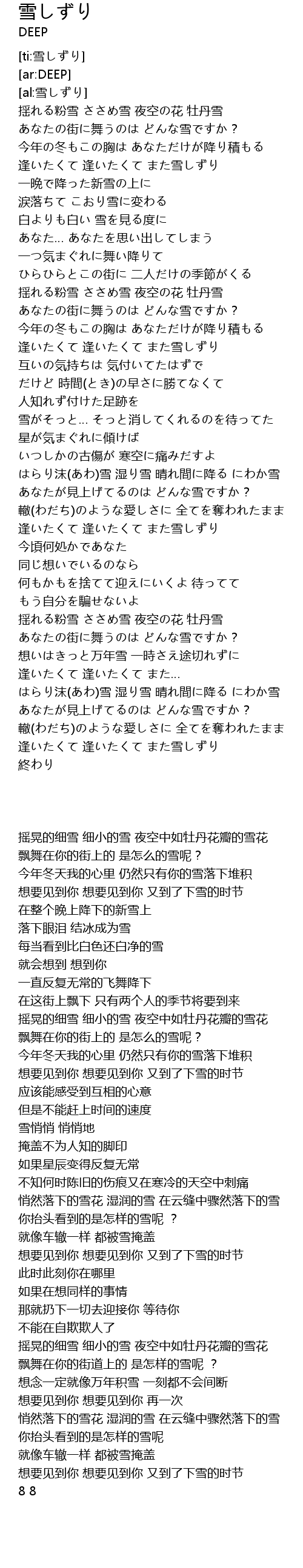 | [00:00.490] | 摇晃的细雪 细小的雪 夜空中如牡丹花瓣的雪花 |