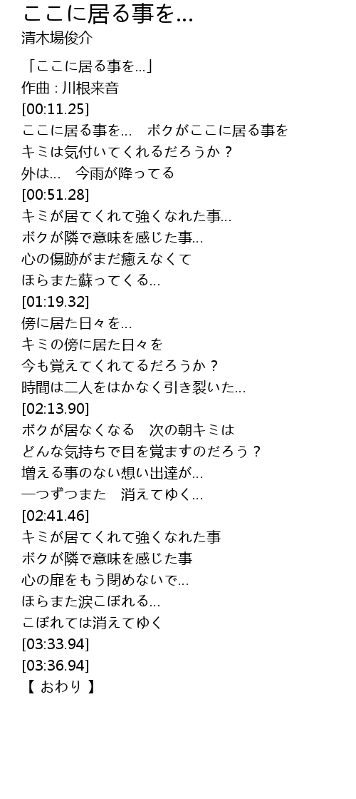 | [00:13.25] | ここに居る事を… ボクがここに居る事を |