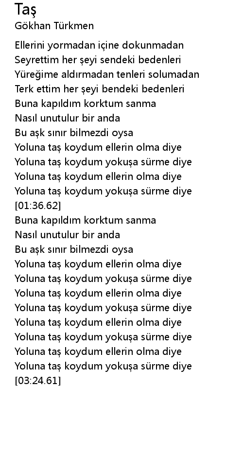 | [03:00.22] | Yoluna ta koydum yoku a sü rme diye |