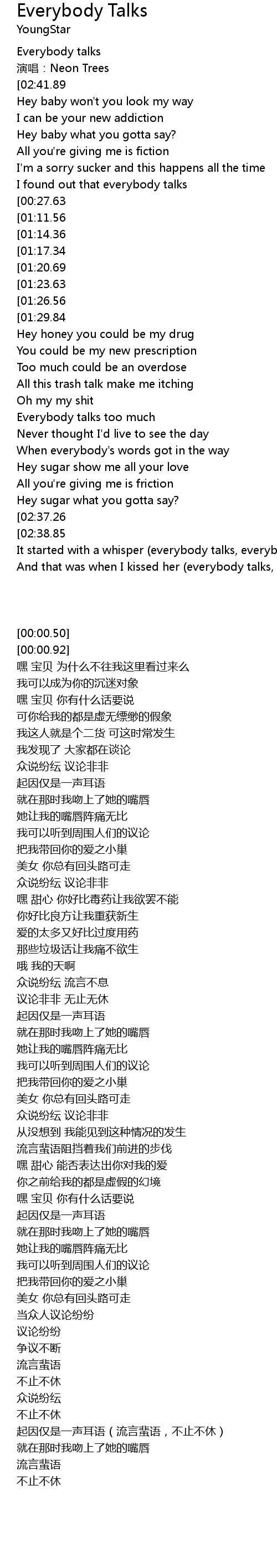 | [02:49.97][02:37.26][02:35.34][02:34.19][02:32.20][02:31.07] | Everybody talks |