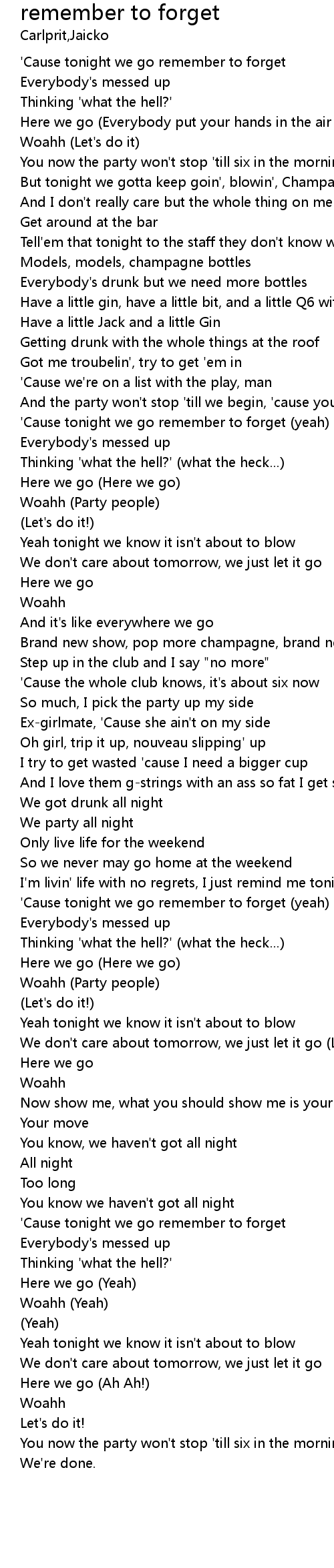 | I'm livin' life with no regrets, I just remind me tonight to forget | |