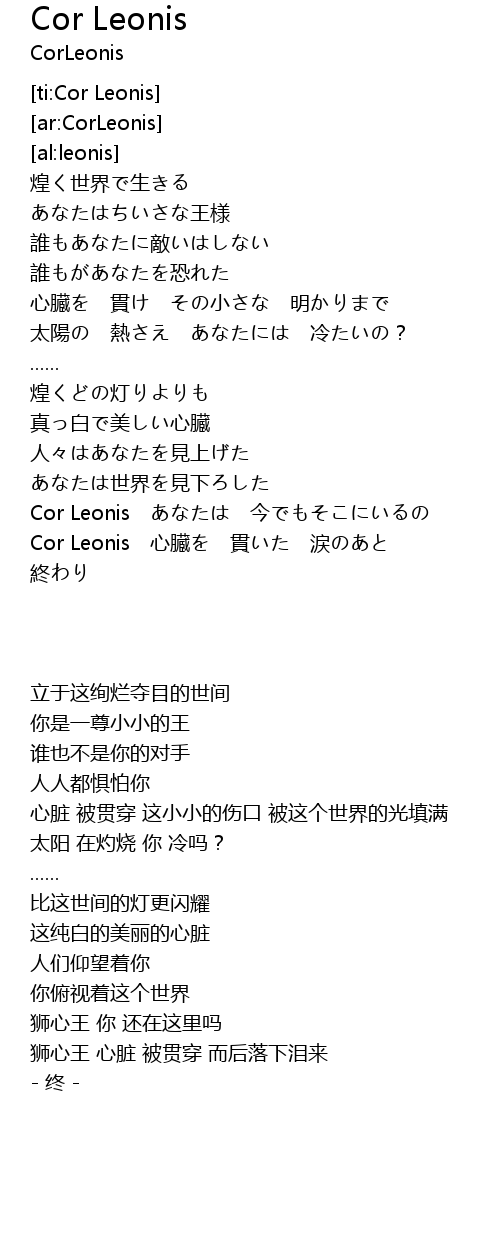 | [01:56.72] | Cor Leonis xīn zàng guàn lèi |