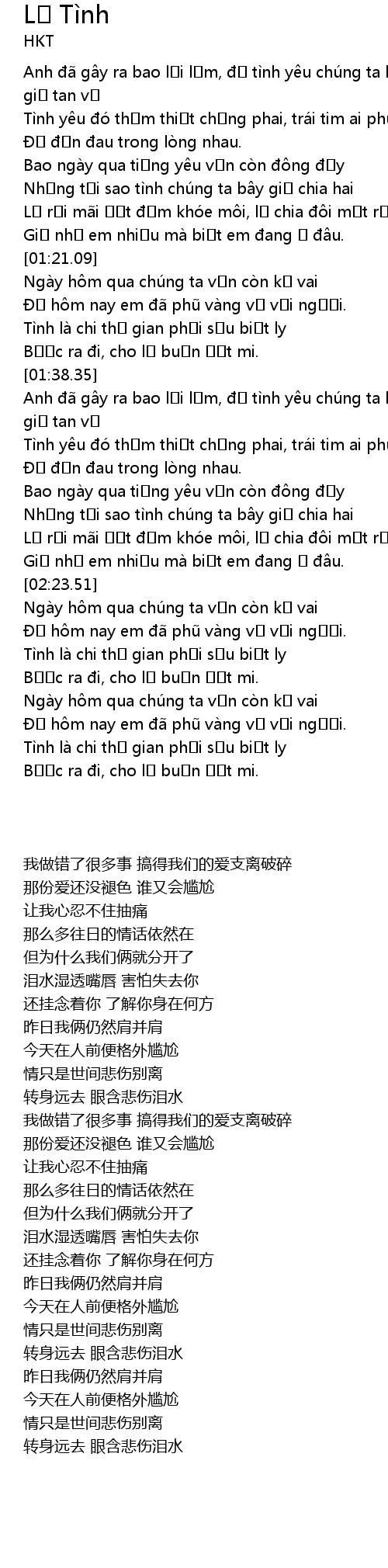 | [02:17.95] | Lệ rơi mãi ướt đẫm khóe môi, lỡ chia đôi mất rồi |