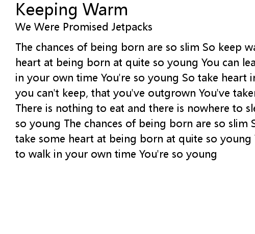 The chances of being born are so slim So keep warm, so keep warm And take some heart at being born at quite so young You can learn to talk, and learn to walk in your own time You're so young So take heart in being born Making plans that you can't keep, that you've outgrown You've taken this too far now take me home There is nothing to eat and there is nowhere to sleep in these four walls You're so young The chances of being born are so slim So keep warm, so keep warm And take some heart at being born at quite so young You can learn to talk and learn to walk in your own time You're so young |