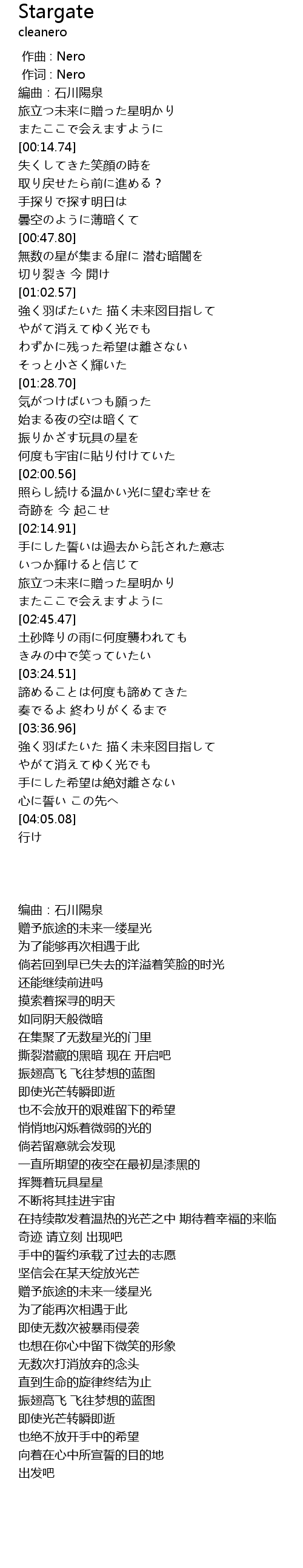 | [00:48.20] | 無数の星が集まる扉に 潜む暗闇を |