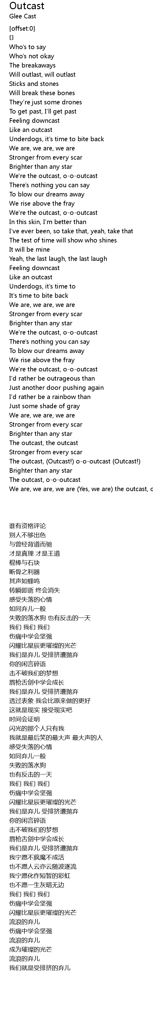 | [02:25.281] | We' re the outcast, oooutcast |