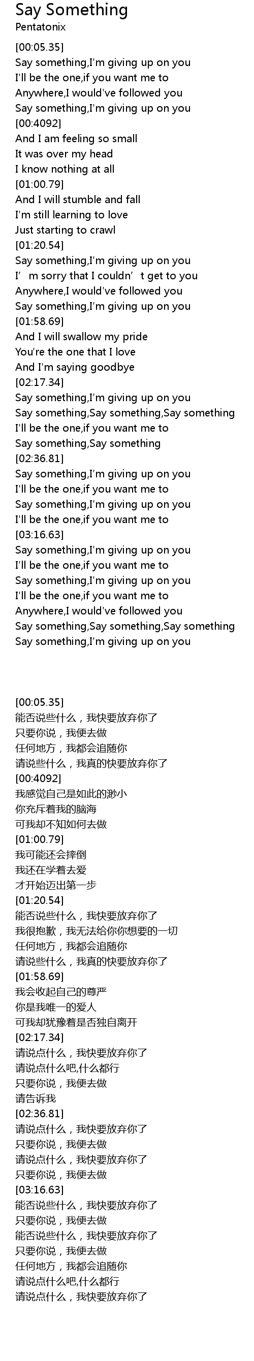 | [03:37.31] | Say something, I' m giving up on you |