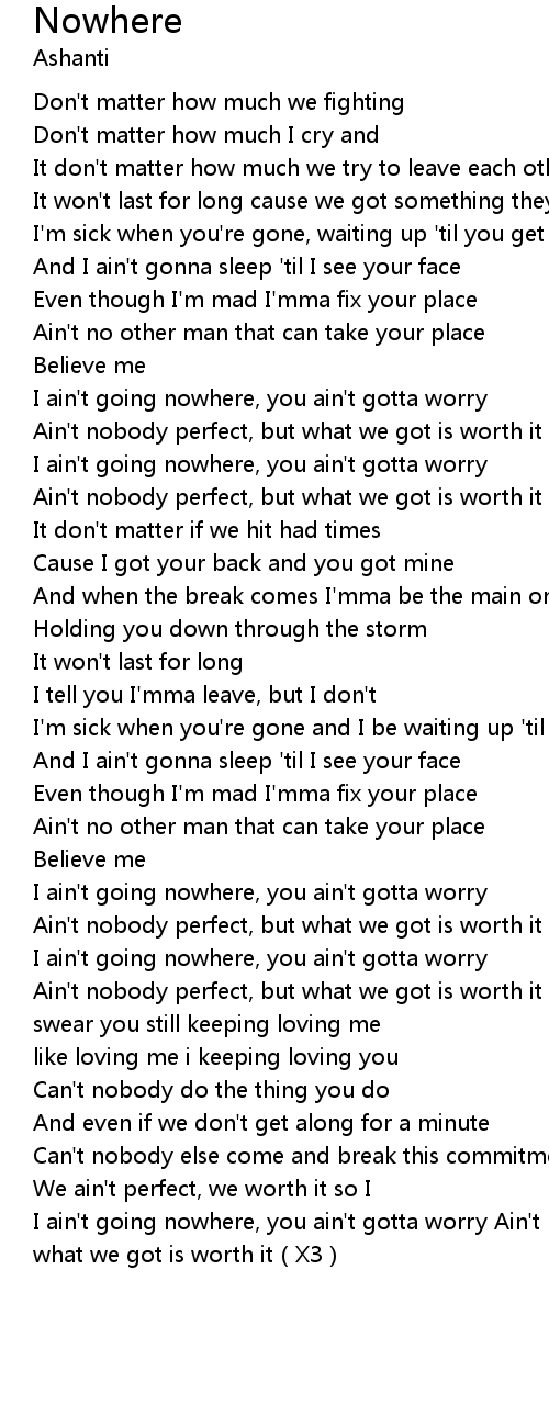 | [02:26.07] | I ain't going nowhere, you ain't gotta worry Ain't nobody perfect, but what we got is worth it(X3) |