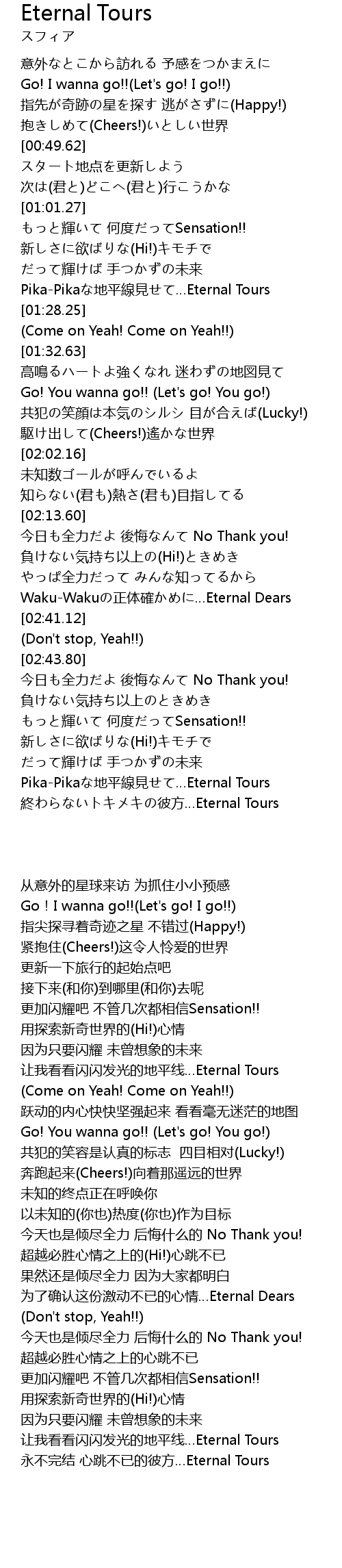 | [01:19.59] | Pika-Pikaな地平線見せて…Eternal Tours |