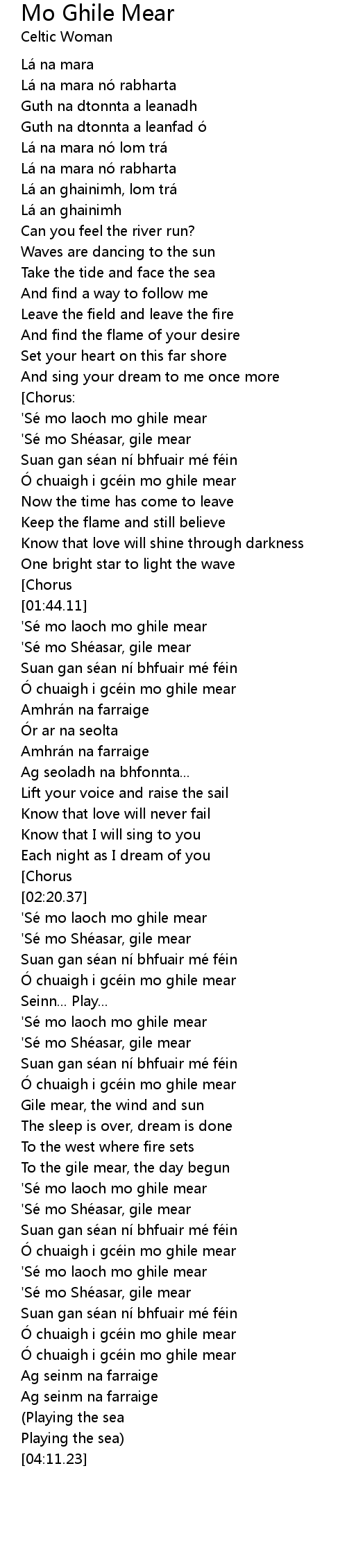 | [01:44.84] | ' Se mo laoch mo ghile mear |