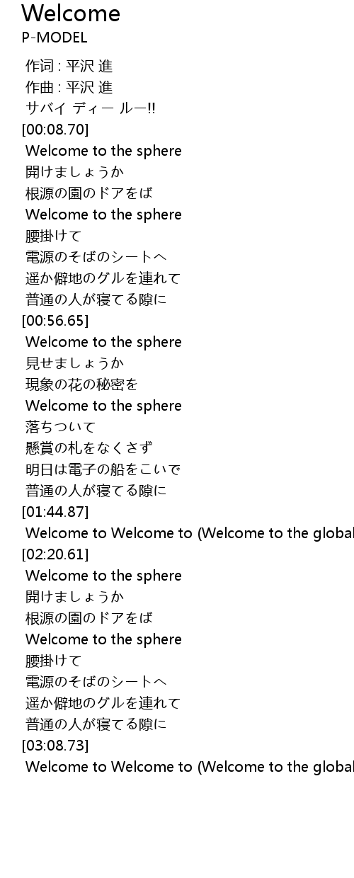 | [03:12.60] | Welcome to Welcome to (Welcome to the global village) |