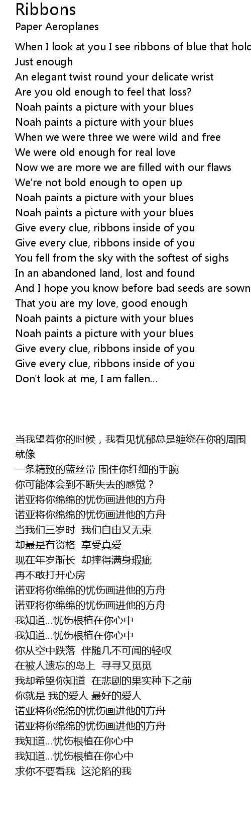 | [00:11.000] | When I look at you I see ribbons of blue that hold you up |