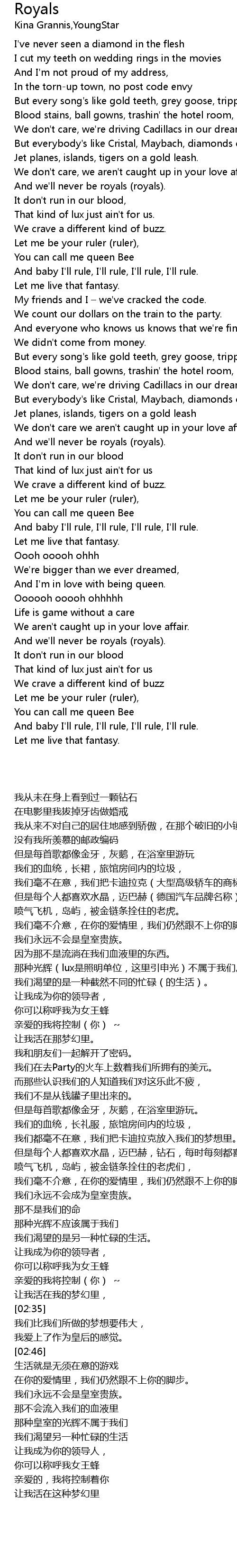 | [02:56] | And we'll never be royals (royals). |