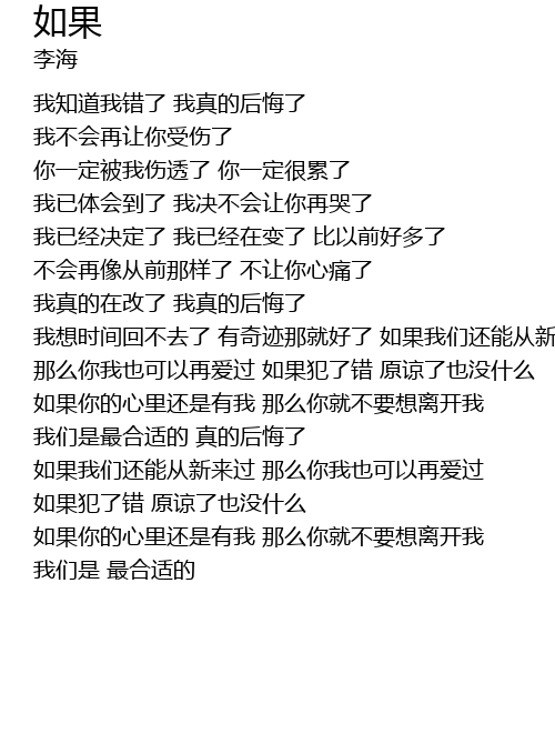 | 我想时间回不去了 有奇迹那就好了 如果我们还能从新来过 那么你我也可以再爱过 如果犯了错 原谅了也没什么 | |