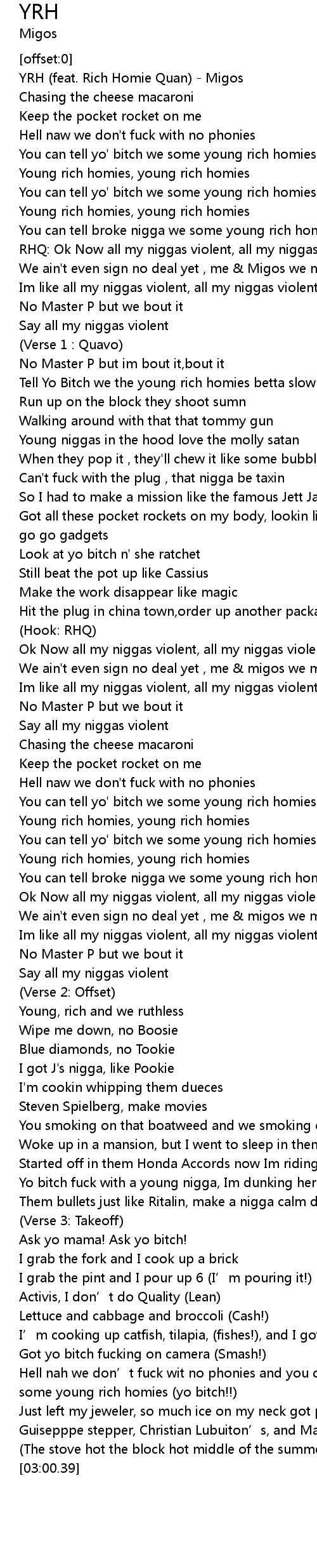 | [00:00.59] | YRH (feat. Rich Homie Quan) - Migos |
