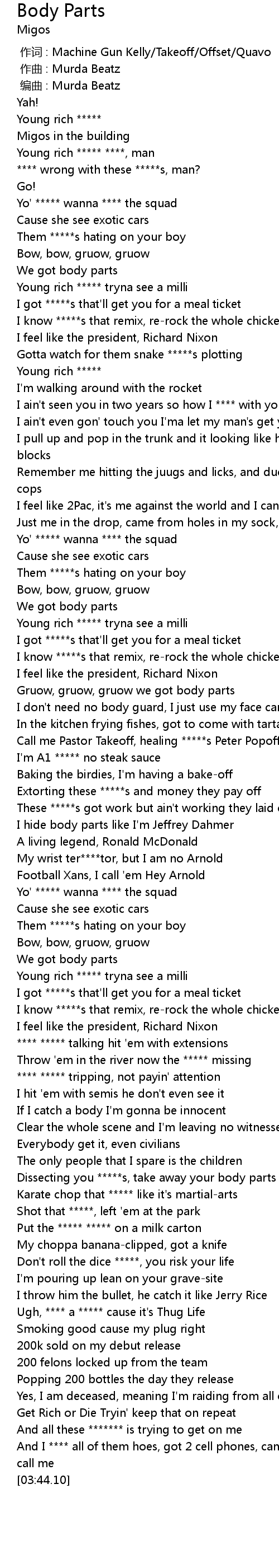 | [03:00.76] | Dissecting you *****s, take away your body parts |