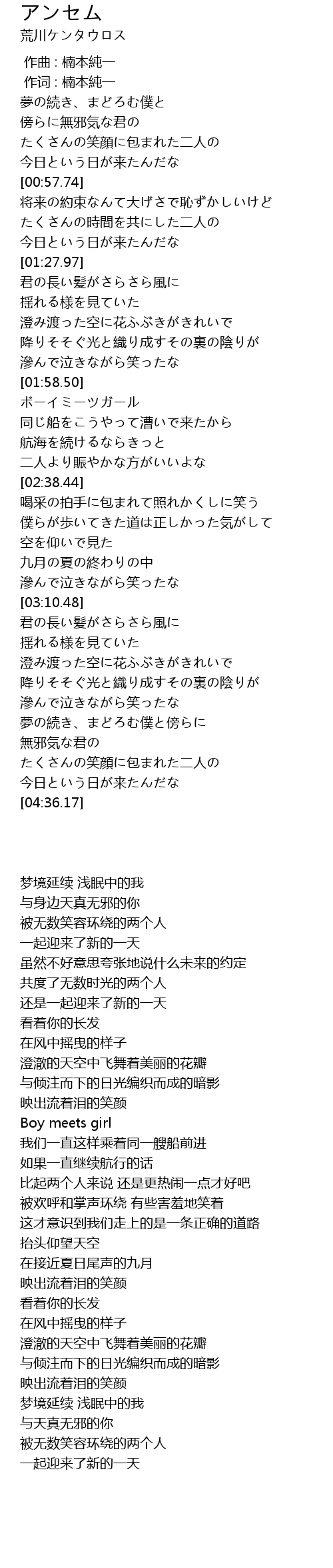 | [04:05.82] | 夢の続き、まどろむ僕と傍らに |