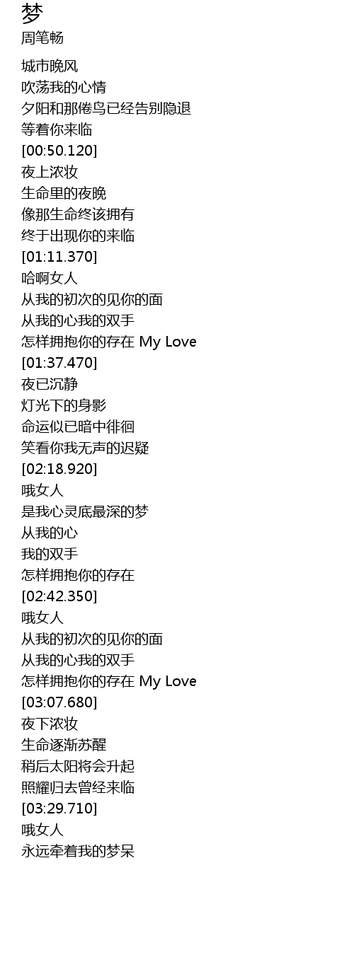 | [03:38.040] | yǒng yuǎn qiān zhe wǒ de mèng dāi |