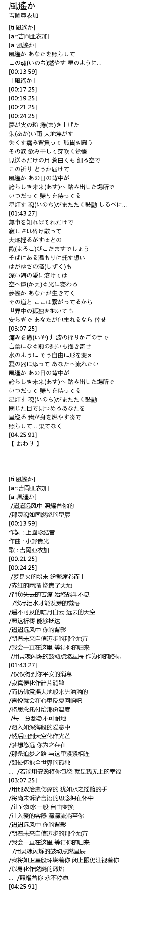 | [00:01.67] | /迢迢远风中 照耀着你的 |