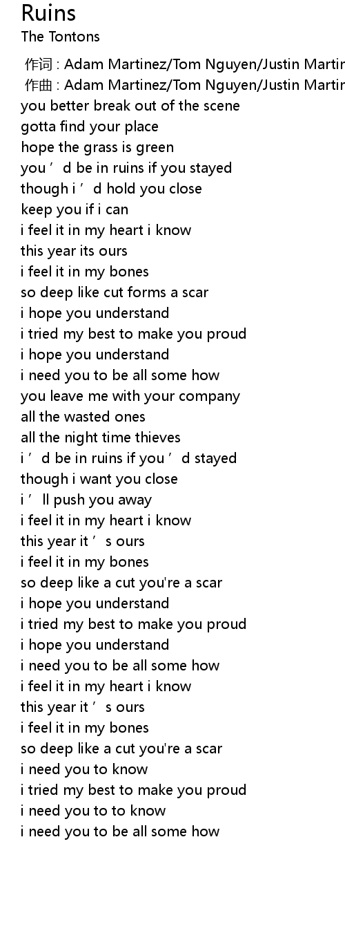 | [02:00.226] | i ’d be in ruins if you ’d stayed |