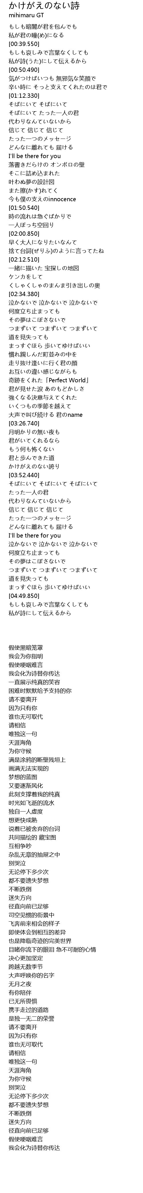 | [00:45.300] | 私が詩(うた)にして伝えるから |