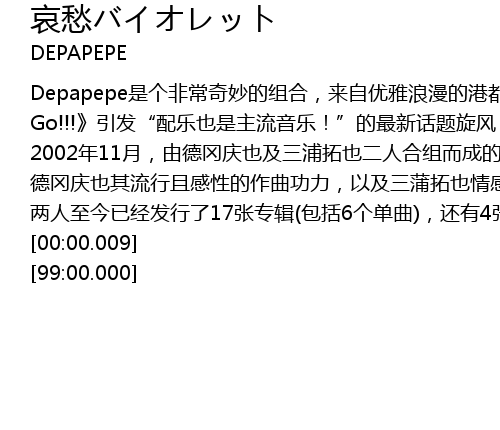 | [00:56.34] | 2002 nian 11 yue, you de gang qing ye ji san pu ta ye er ren he zu er cheng de DEPAPEPE, jin yi er ba kong xin ji ta jiu neng biao xian chu bian hua duo duan di xin xiang feng jing yi ji xi nu ai yue, yi yang yi zhe qing chun qi xi de qing kuai qu feng xuan lv, tan zou chu shu huan ren xin de yin yue kong jian, ru ci yi ji ta ge chang de xiao ying zheng zai xun su man yan kuo san zhong! cong shen hu dao da ban jing du yi ji dong jing, sui zhe jie tou biao yan de jing yan lei ji, DEPAPEPE shun jian kai qi le zhi ming du ji ren qi! |