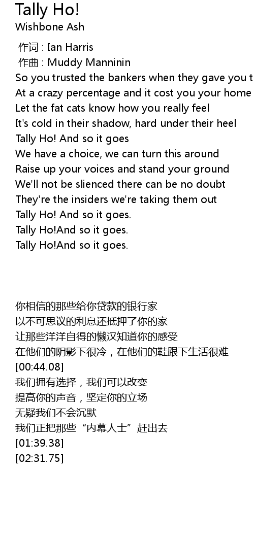 | [02:31.75] | Tally Ho!And so it goes. |