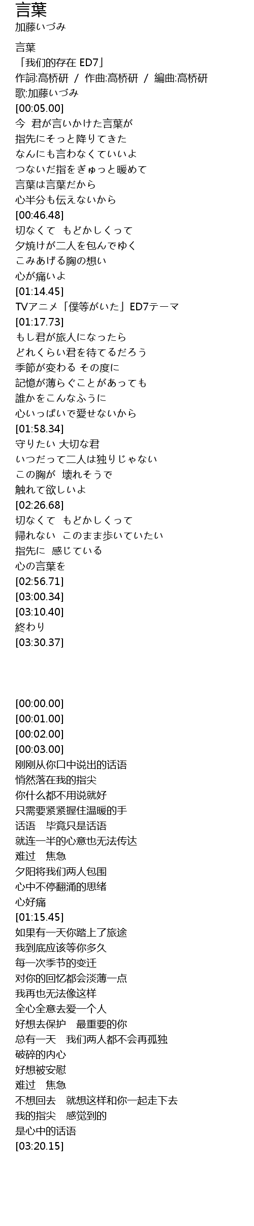 | [01:15.45] | TVアニメ「僕等がいた」ED7テーマ |