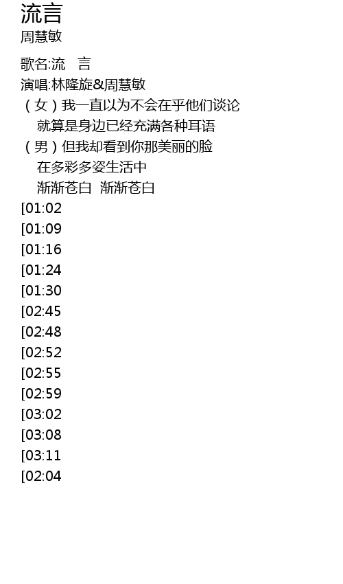 | [03:15][02:45][01:34] | (男)流言传来传去 说不停 |