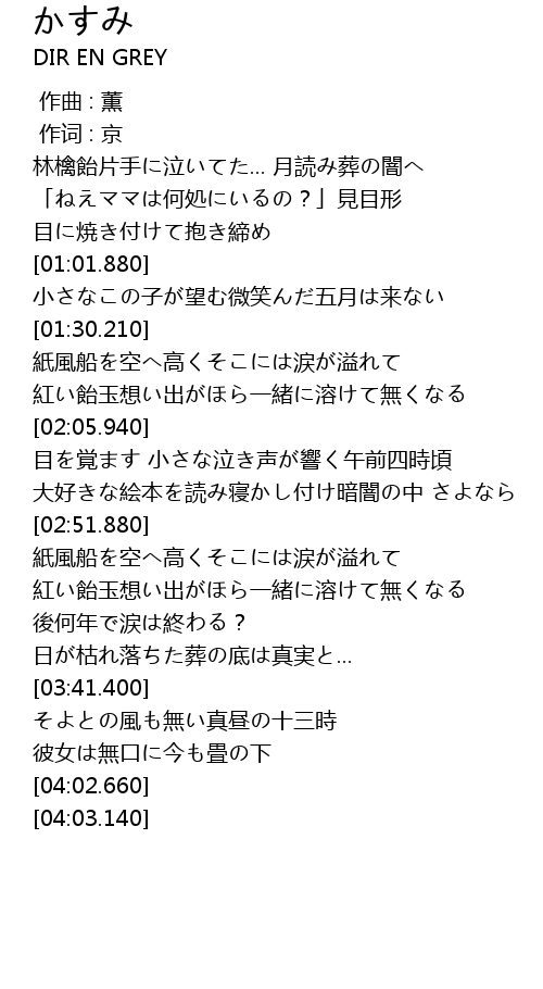 | [03:18.920] | 後何年で涙は終わる? 日が枯れ落ちた葬の底は真実と... |
