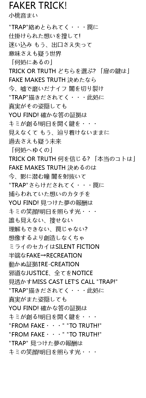 | [03:09.29] | "FROM FAKE・・・" "TO TRUTH!" |