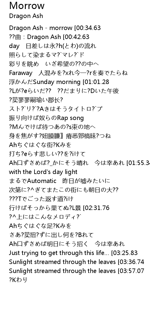 | [00:00.00]Dragon Ash - morrow [00:34.63]作?~:kj [00:36.63]作曲:Dragon Ash [00:38.63]??曲:Dragon Ash [00:42.63]とあるBrighter day 日差しは永?h(とわ)の流れ [00:46.49]照らして染まるマ?`マレ?`ド [00:48.54]彩りを眺め いざ希望の??の中へ [00:53.58]Faraway 人混みを?xれ今一?rを奏でたらね [00:58.84]浮かんだSunday morning [01:01.28]まるでいつか??たDay dream [01:04.62]?Lが?eらいだ?? ??だまりに?Dいた午後 [01:08.87]?荬蓼蓼嗣瑜い郡长? [01:10.86]スト?`リ?`?Aきはそうタイトロ?`プ [01:14.10]振り向けば奴らのRap song [01:16.21]?Mんでけば待つあの?s束の地へ [01:19.96]身を焦がす?妞膜臁〗瘠悉郅槁昧?つね [01:35.86]Ahちぐはぐな街?Kみを [01:41.93]打ち?eらす悲しい??を?iけて [01:46.09]Ah口ずさめば?_かにそう晴れ 今は幸あれ [01:55.34]Just trying to get through this life… [02:13.90]with the Lord's day light [02:16.72]まるでAutomatic 昨日が嘘みたいに [02:20.55]次第に?^ぎてまたこの街にも朝日の大?? [02:25.84]???Tでごった返す道?iけ [02:28.44]行けばそっから果てぬ?L景 [02:31.76]色づけばそうOne and only [02:34.43]?^上にはこんなメロディ?` [02:47.78]Ahちぐはぐな足?Kみを [02:53.65]さあ?荬扭?ずに出し何を?Bれて [02:58.09]Ah口ずさめば明日にそう招く 今は幸あれ [03:07.34]Just trying to get through this life… [03:25.83]with the Lord's day light [03:29.16]Sunlight streamed through the leaves [03:36.74]to the ground when I came around [03:49.52]Sunlight streamed through the leaves [03:57.07]to the ground when I held out my hands [04:24.86] | ?Kわり |