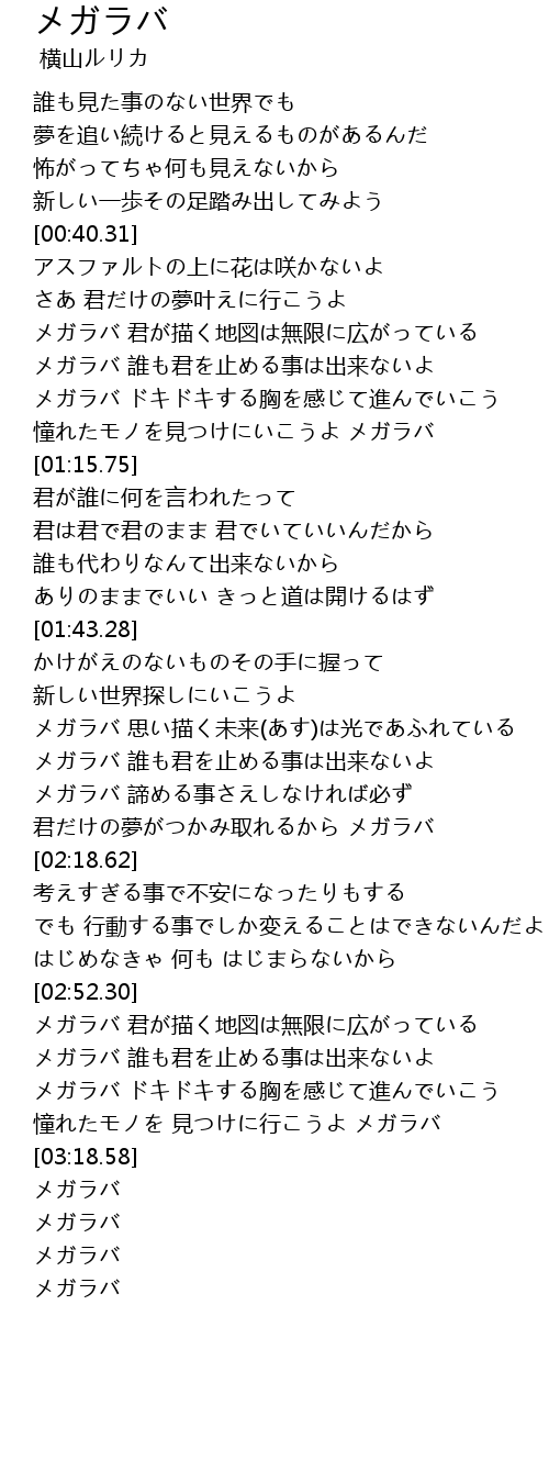 | [03:11.89] | 憧れたモノを 見つけに行こうよ メガラバ |