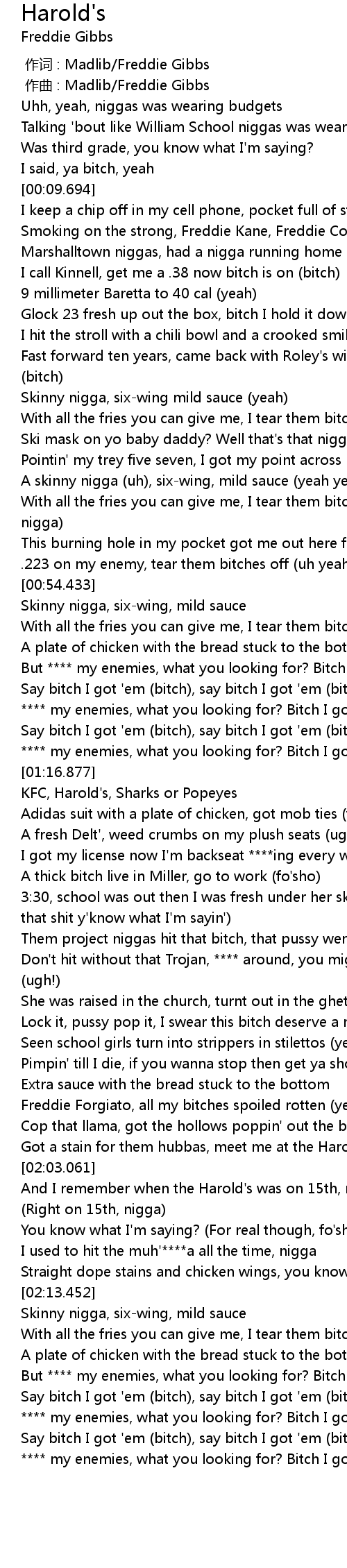 | [02:33.084] | Say bitch I got ' em bitch, say bitch I got ' em bitch |