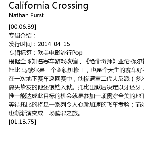 | 专辑 | Need for Speed (Original Motion Picture Score) |