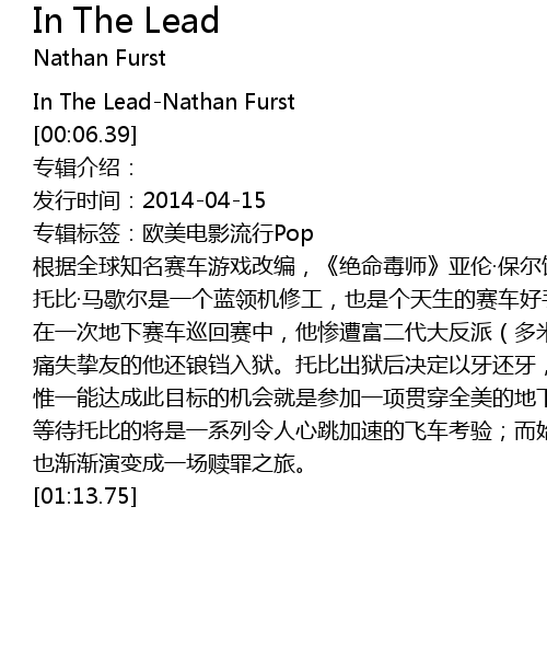 | 专辑 | Need for Speed (Original Motion Picture Score) |