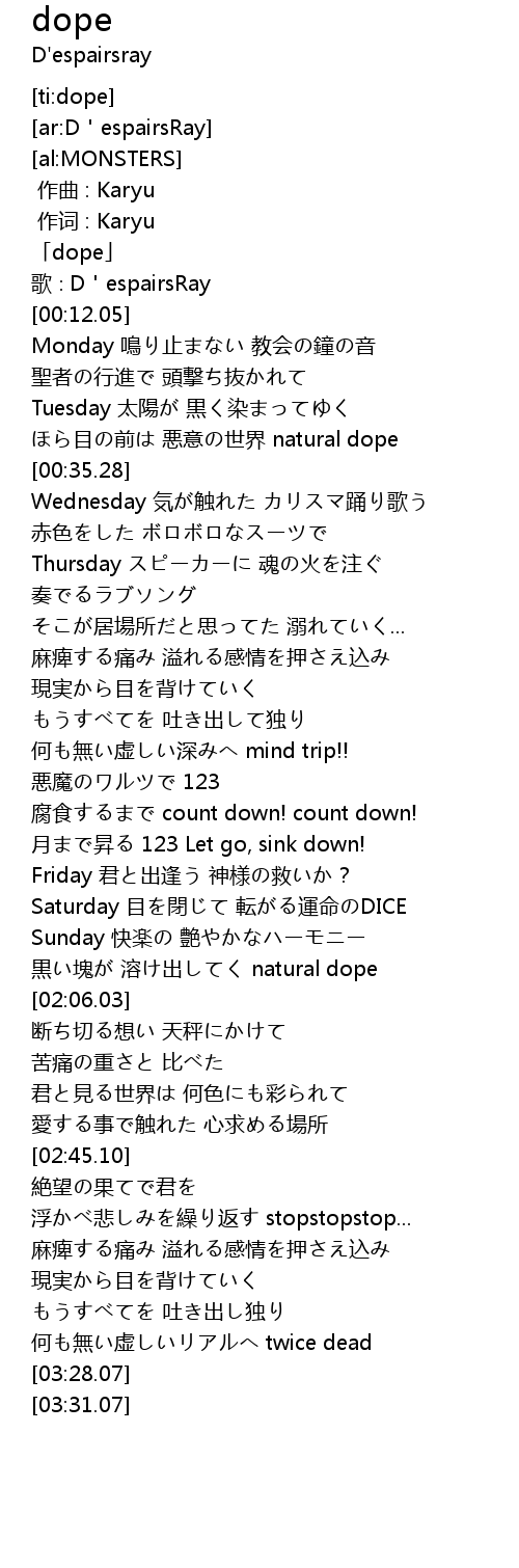 | [02:00.44] | 黒い塊が 溶け出してく natural dope |