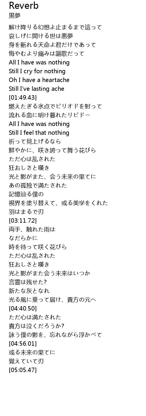 | [00:59.03] | 解け降りる幻想よ止まるまで這って |