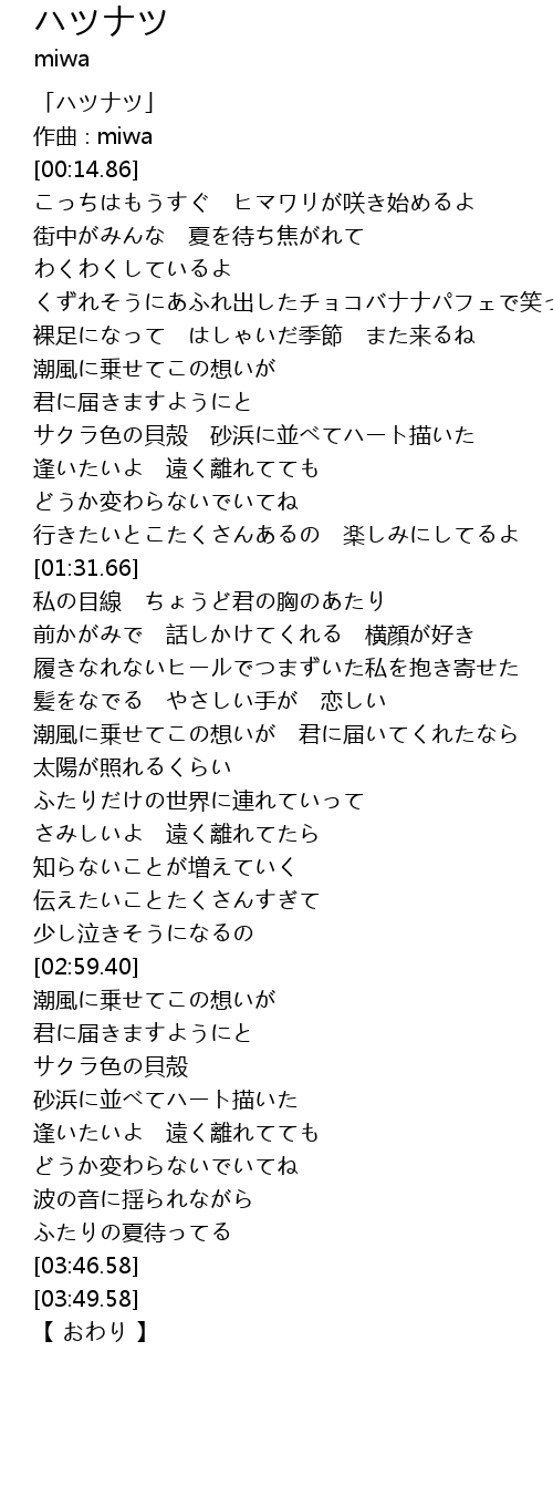 | [00:49.58] | 裸足になって はしゃいだ季節 また来るね |