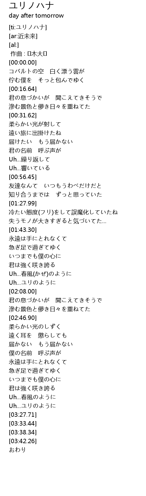 | [01:59.91] | Uh...春風(かぜ)のように |