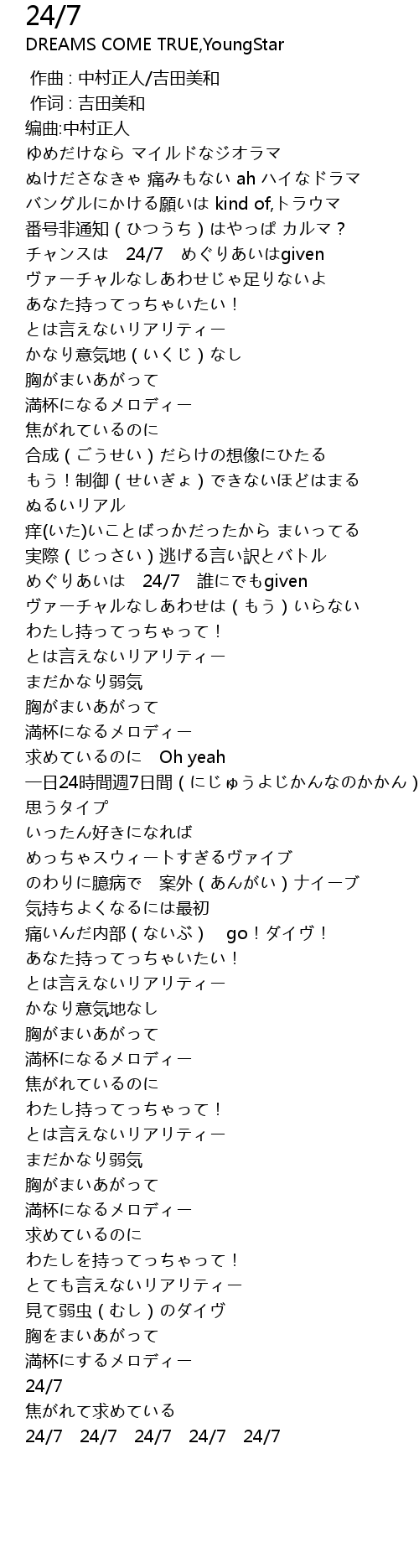 | [01:39.177] | めぐりあいは 24/7 誰にでもgiven |